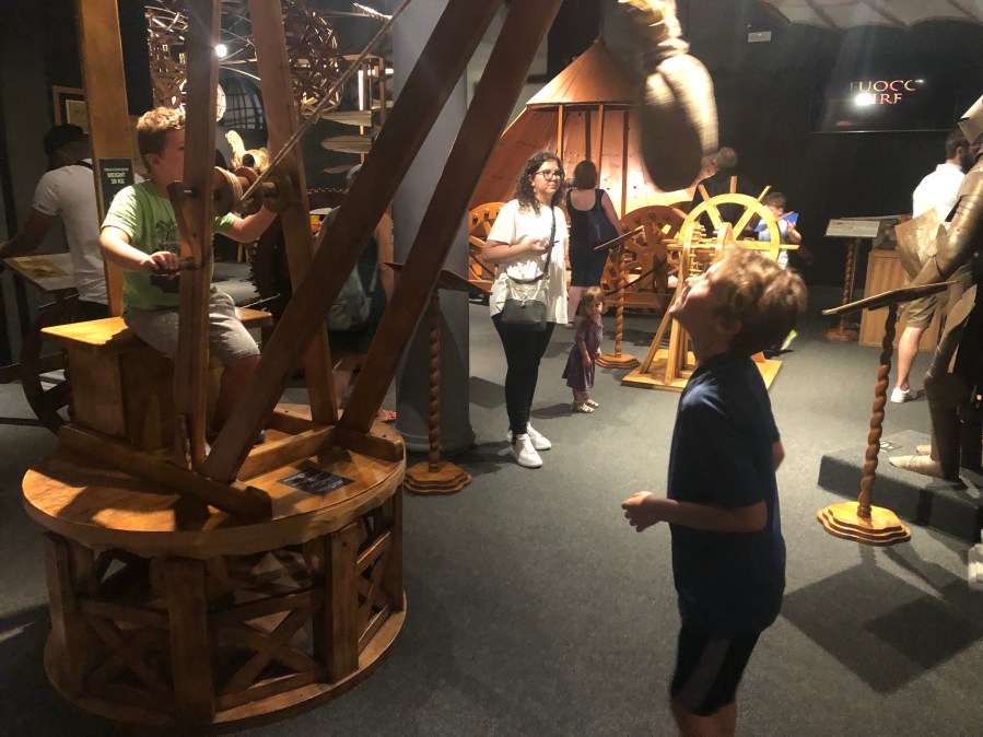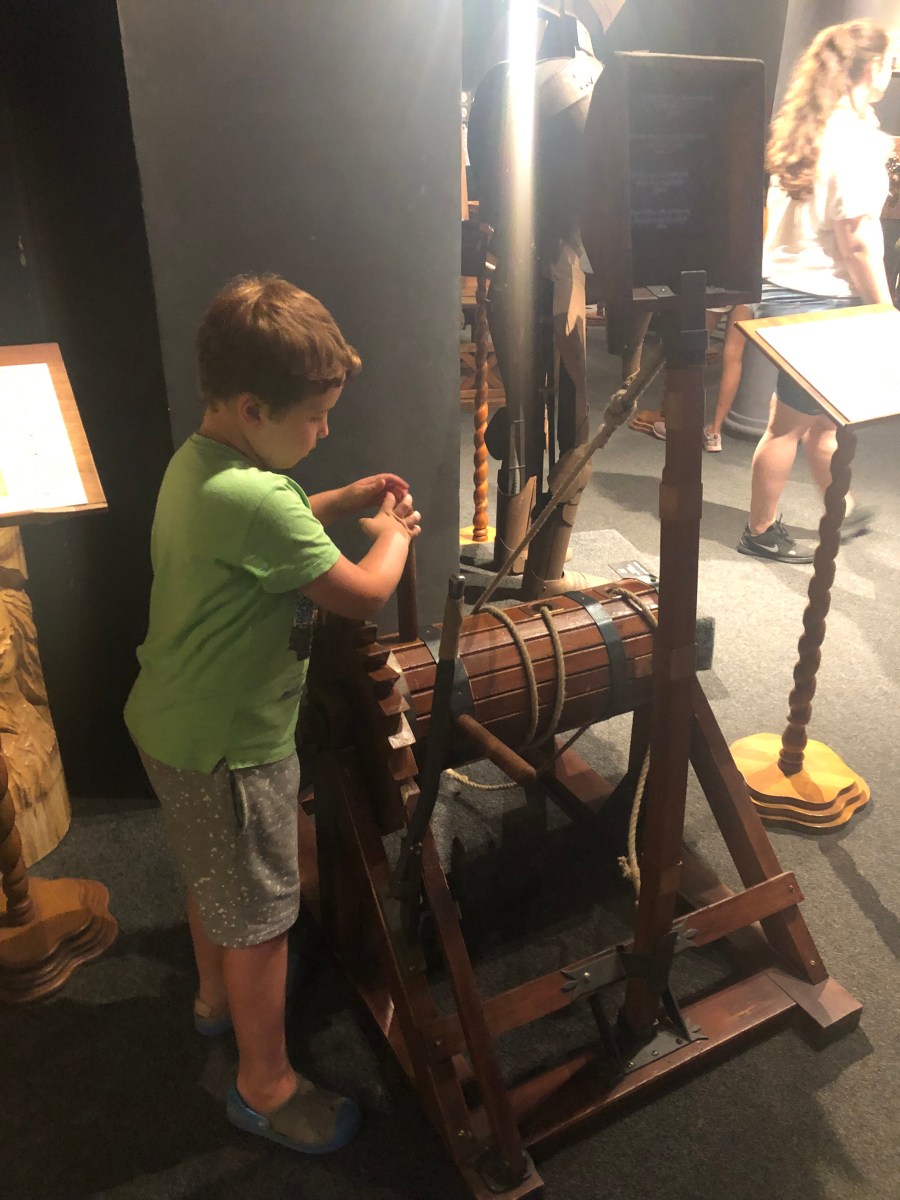 Next on the list was the Leonardo de Vinci museum, it featured in every article of things to do in Florence so off we trotted. Si & I we’re a bit sceptical, it looked like a tiny shop & the entrance to the museum was at the back behind a black curtain. I had visions of a couple of pictures on the wall and a five minute experience for our €30 but we shouldn’t be so cynical. It is fairly small for a museum but it’s packed with interactive models of many of Da Vinci’s inventions, so great for kids. They get hold of the replicas of the machinery and can really see & feel how it all works. Brilliant for budding engineers.