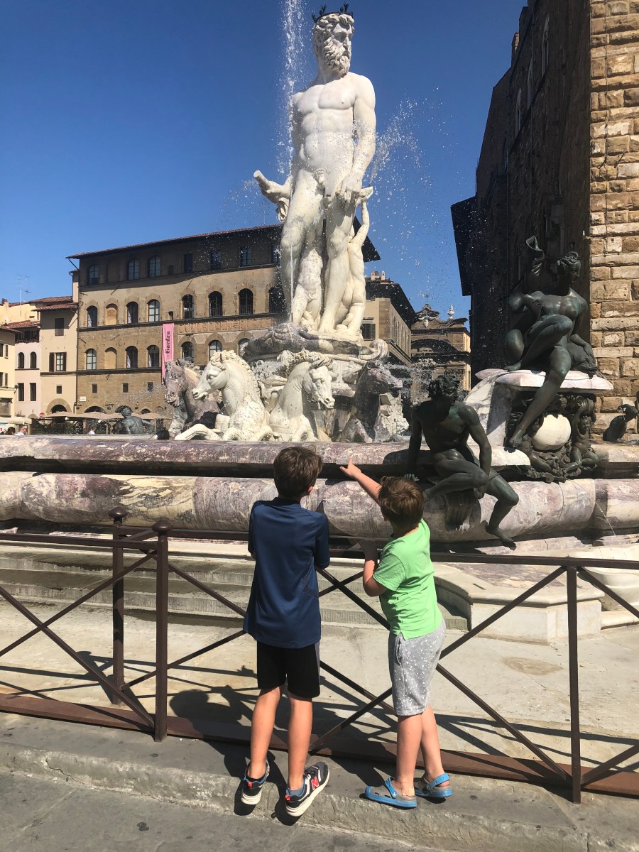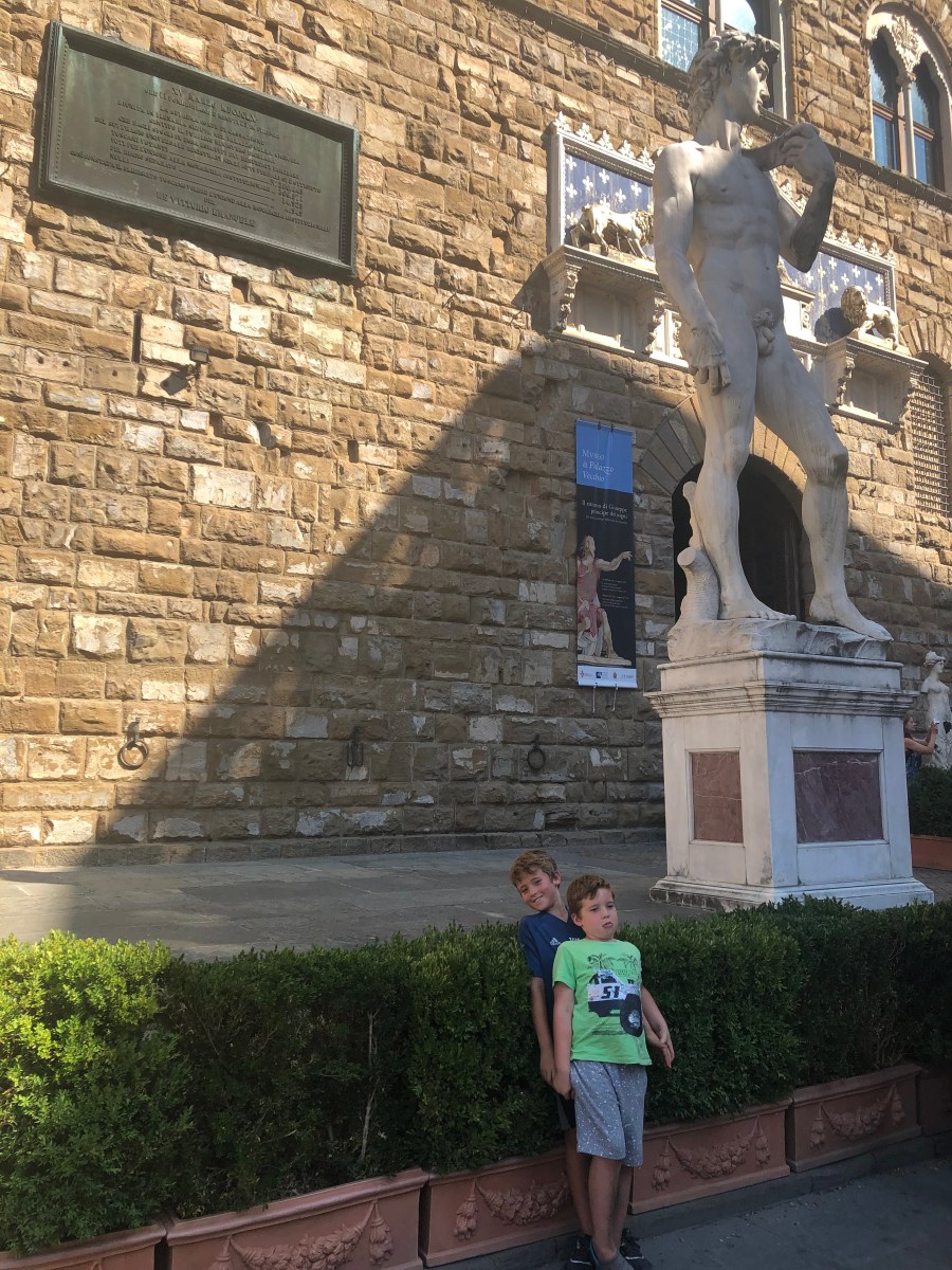 On to our next mission, a photo of the boys with Michelangelo’s David. The gallery where the original lives was closed but the replica in Piazza della Signoria is always open so we headed there.